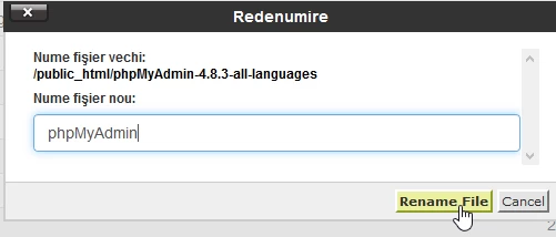 - apparirà una nuova directory con il nome dell'archivio rispettivo, ma senza l'estensione .zip, all'interno della directory public_html. Questa directory deve essere rinominata in modo che rimanga solo "phpMyAdmin". La rinomina avviene selezionando la directory in questione e premendo il pulsante "Rinomina" dalla barra in alto della pagina.