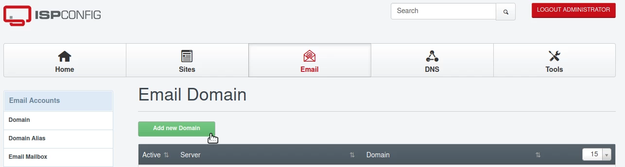 - ISPConfig offre la possibilità di creare caselle di posta elettronica associate ai domini posseduti. Per creare caselle di posta elettronica, sarà necessario prima aggiungere il dominio nel pannello, nel menu Dominio sotto la categoria Account Email.