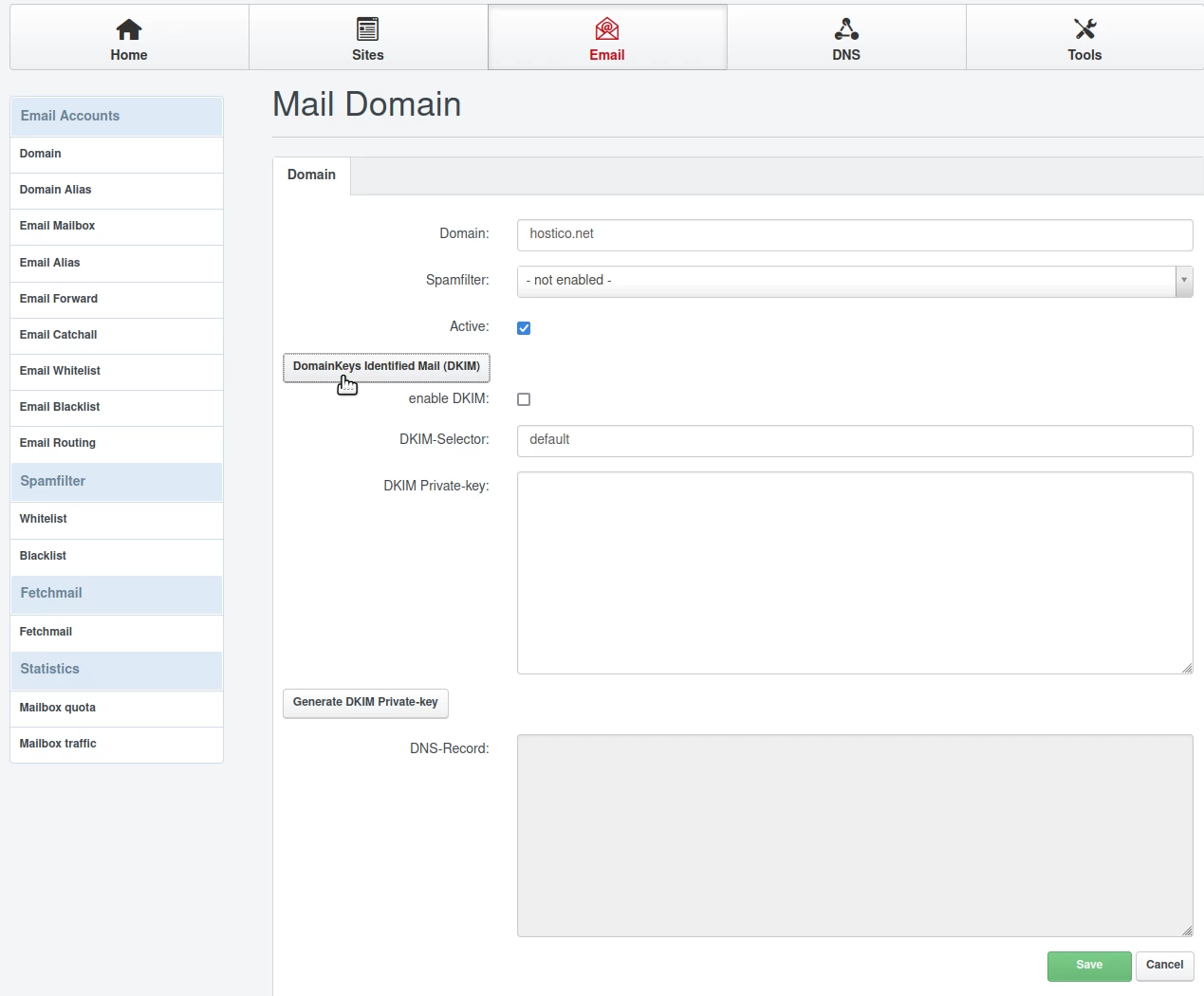 - Attivo: Lasceremo la casella di controllo; Se vogliamo impostare anche DKIM (protezione da spam/phishing), cliccheremo il pulsante DomainKeys Identified Mail (DKIM); È consigliato seguire anche questo passaggio;