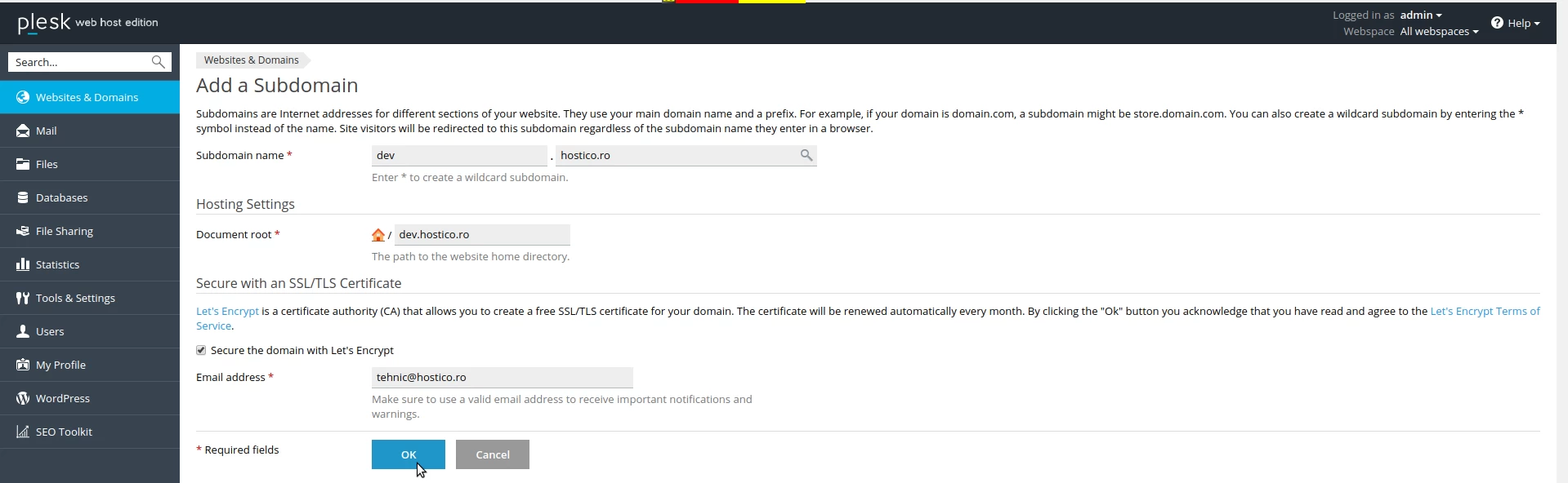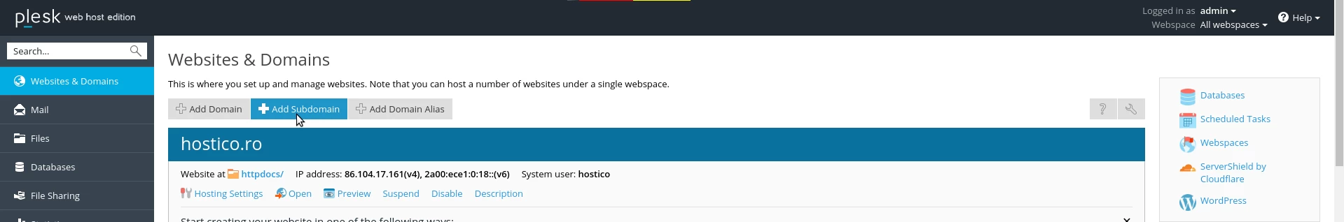 Aggiungere un sottodominio nel pannello di amministrazione Plesk.