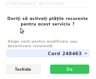 - La finestra appena aperta ci chiede di selezionare una carta salvata nell'account. Selezioniamo la carta da cui vogliamo che venga prelevato l'importo e facciamo clic su SÌ. Se l'operazione è andata a buon fine, verrà visualizzato il messaggio "Il pagamento ricorrente è stato attivato".