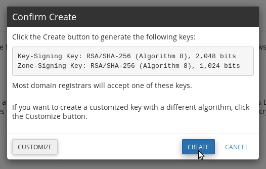 - Dopo di ciò, fai clic nuovamente sul pulsante Crea. Se abbiamo bisogno di impostazioni personalizzate, possiamo fare clic sul pulsante Personalizza. Le impostazioni predefinite funzioneranno con la maggior parte dei registrar.