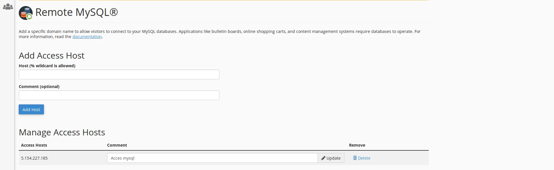 - In questo tutorial, ti mostreremo come configurare l'accesso a Remote MySQL® nell'account cPanel. L'accesso a Remote MySQL® non è abilitato per impostazione predefinita e devi inviarci un'email a help@hostico.com per la sua attivazione, accompagnata da un indirizzo IP da cui verrà effettuata la connessione.