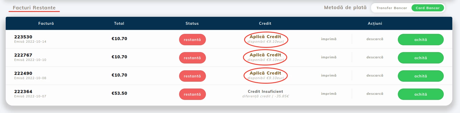 - Il credito può essere applicato solo se il pagatore sulla fattura è lo stesso del caso della fattura di ricarica del credito