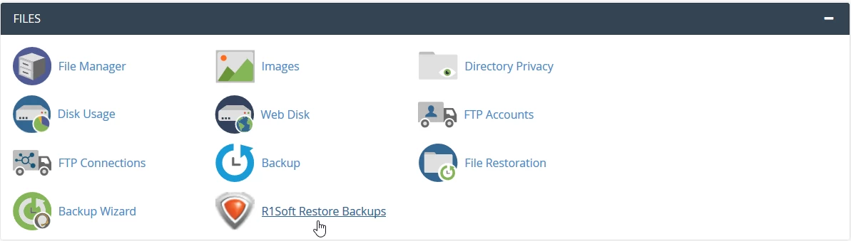 - Una volta accesso al pannello di controllo, andremo alla sezione File e cliccheremo su R1soft Ripristina Backup.