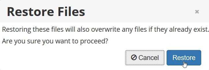 - Ci verrà mostrato un messaggio di avviso, informandoci che i file esistenti nella cartella selezionata verranno sostituiti da quelli di backup. Se vogliamo mantenere una copia dei file attuali, possiamo rinominare la cartella utilizzando File Manager o un client FTP, in modo che i contenuti della cartella non vengano sostituiti dai file di backup (ad esempio rinominando public_html in public_html_old).