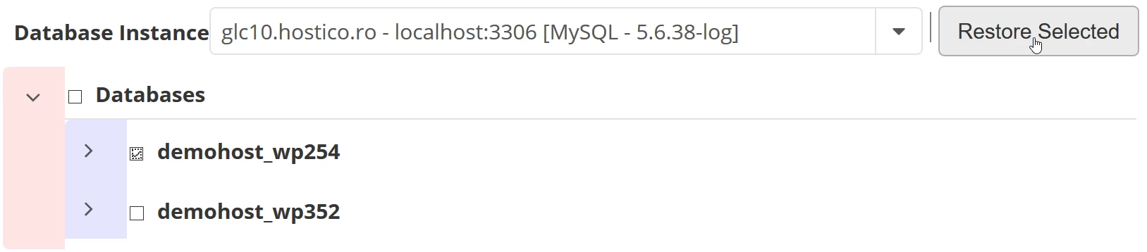 - Successivamente, i database esistenti saranno visualizzati nel punto di ripristino. Selezioneremo la casella a sinistra del database che desideriamo ripristinare e faremo clic su Ripristina selezionato in alto a destra della pagina. Il ripristino sostituirà il database esistente. Se non vogliamo perdere le informazioni in esso, possiamo scaricare una copia attuale utilizzando PhpMyAdmin.