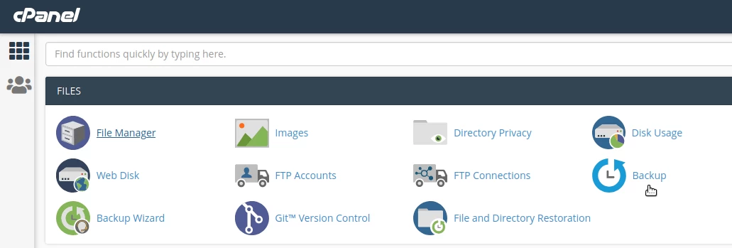 • Dopo aver effettuato l'accesso al pannello di controllo cPanel, nell'interfaccia che verrà visualizzata, cerchiamo la sezione "File" e lì selezioniamo "Backup"