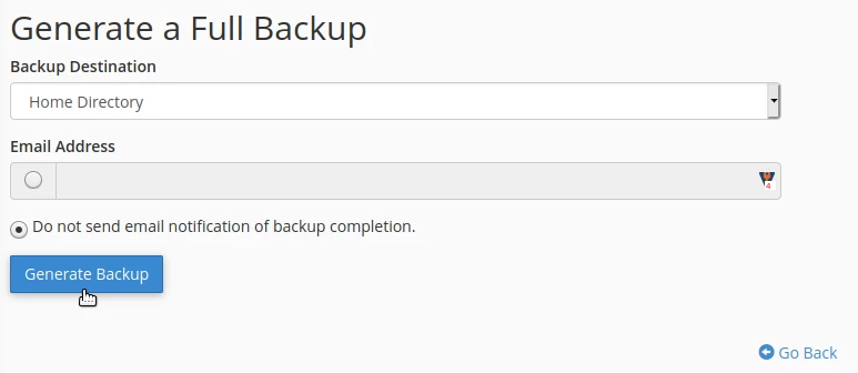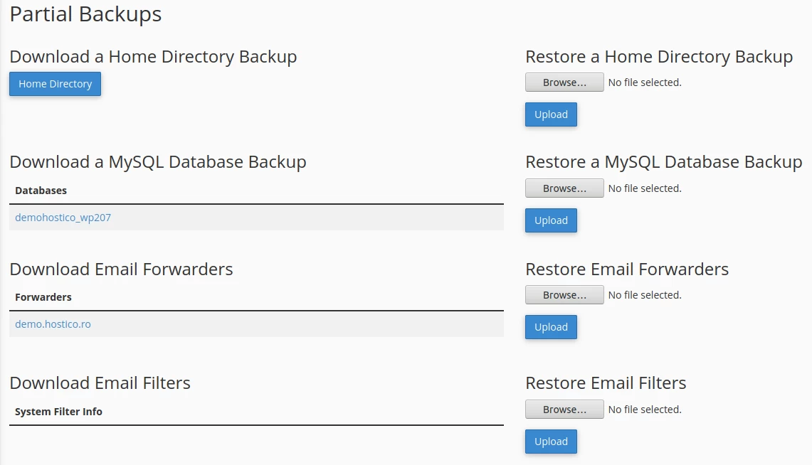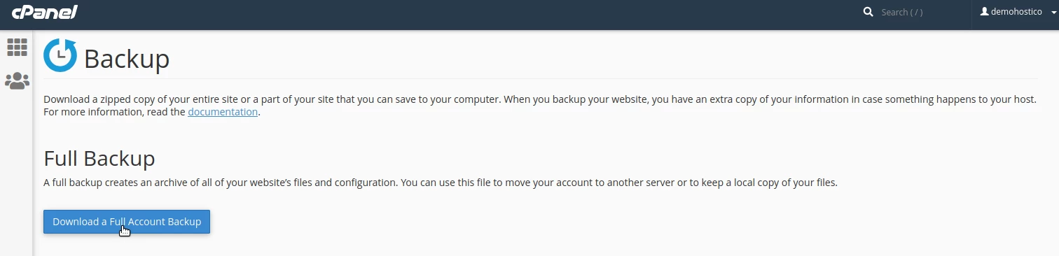 • Questa opzione creerà un archivio con tutti i file e le impostazioni dell'account da salvare, ma dall'interfaccia cPanel, questo archivio non può essere utilizzato per un ripristino completo di un sito. Per un ripristino completo, è necessario contattarci via email a: help@hostico.com
