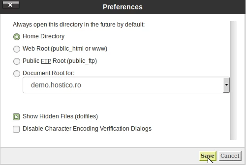 - Nella finestra che apparirà, ci assicureremo che l'opzione Mostra file nascosti (dotfiles) sia selezionata, dopodiché cliccheremo sul pulsante Salva.