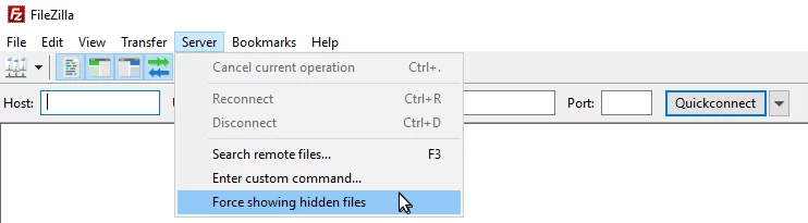 - Per attivare l'elenco dei file nascosti, fare clic su Server dalla barra delle opzioni in FileZilla, quindi selezionare l'opzione Forza Visualizzazione File Nascosti.